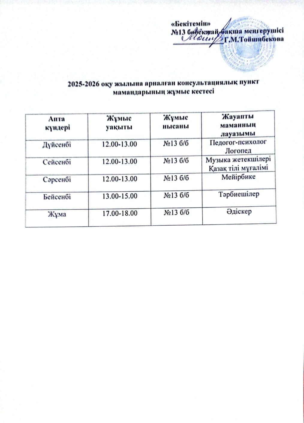 02 сентябрь 2025 0 1 2 3 4 5 2025-2026 оқу жылына арналған консультациялық пункт мамандарының жұмыс кестесі