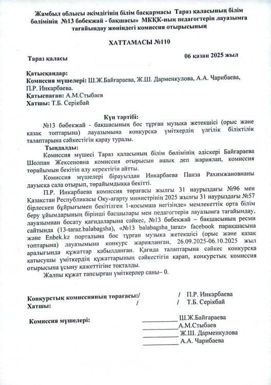 Конкурс нәтижесі (Музыка жетекшісі қазақ және орыс топтарына) » №13 бөбекжай бақшасы