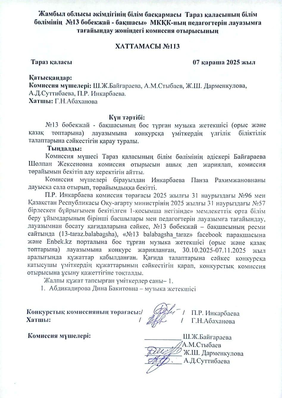 Музыка жетекшісі (Қазақ және орыс топтарына) лауазымына құжат тапсырған үміткерлер » №13 бөбекжай бақшасы