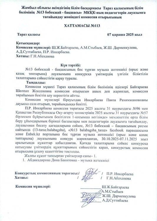 » » Музыка жетекшісі (Қазақ және орыс топтарына) лауазымына құжат тапсырған үміткерлер