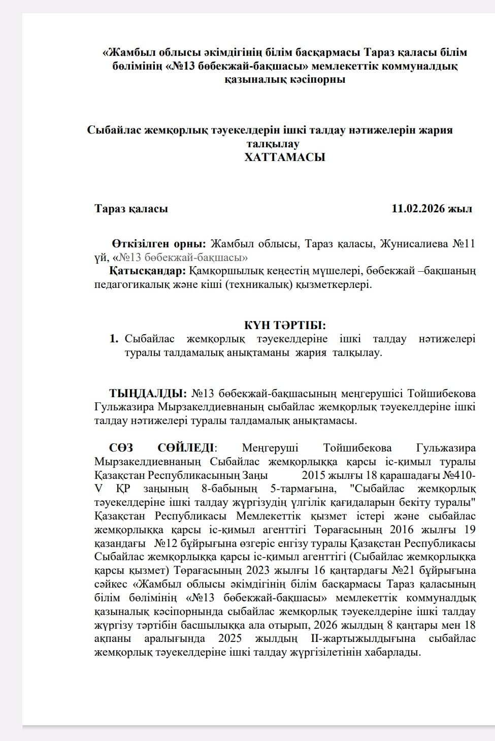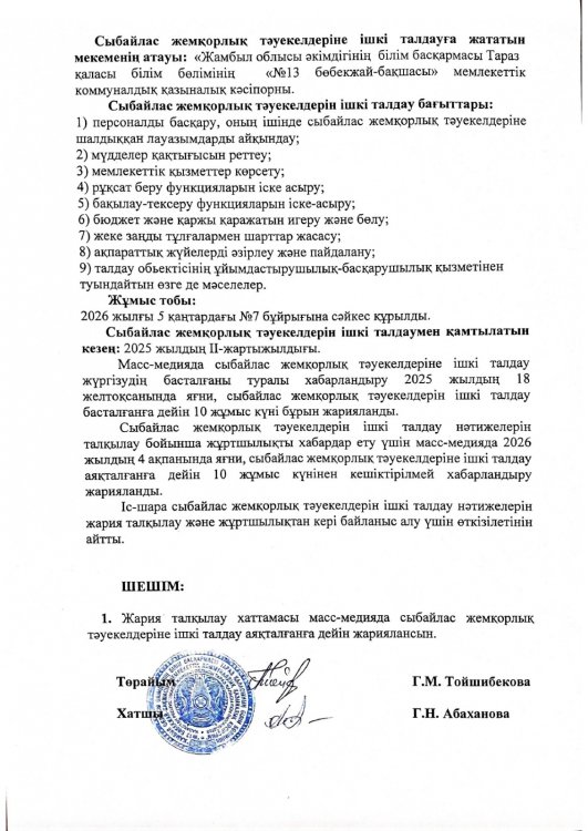 Сыбайлас жемқорлық тәуекелдерін ішкі талдау нәтижелерін жария талқылау ХАТТАМАСЫ » №13 бөбекжай бақшасы